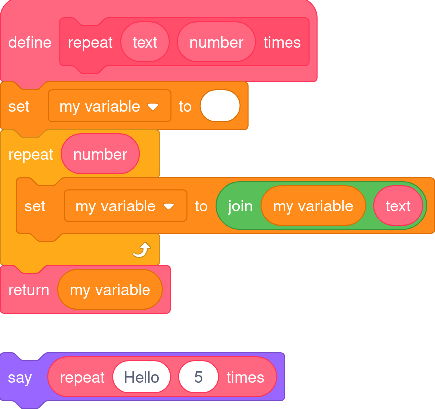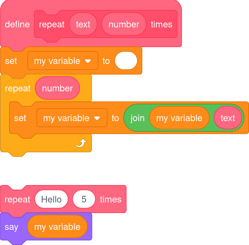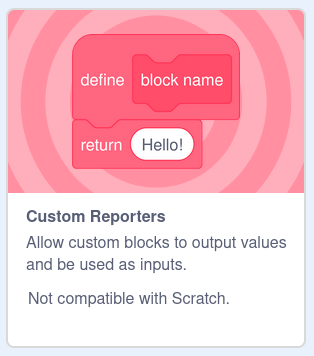 TurboWarp now supports custom reporters which lets you use any custom block in your project as a reporter, like the addition block built into Scratch. This is a pretty standard feature in text-based programming languages, but it can be hard to understand initially.